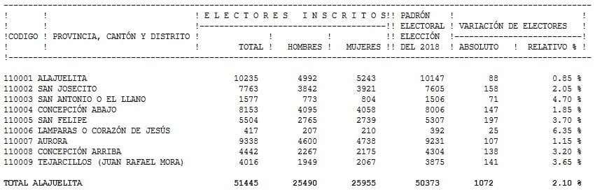 En total, en la actualidad Alajuelita cuenta con 51,445 personas empadronadas con derecho a ejercer su voto de cara a las elecciones municipales que se llevarán a cabo el 2 de febrero del 2020. Para las elecciones presidenciales el padrón del cantón era de 50,373.