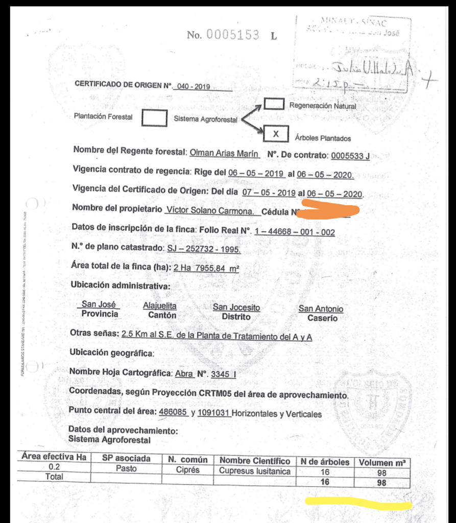 Según trascendió, todo inició con una tala de árboles de ciprés en una finca a nombre de Víctor Solano, la cual contaba con la autorización para la corta de 16 cipreses, según un documento del cual AlajuelitaSoy.com obtuvo copia.